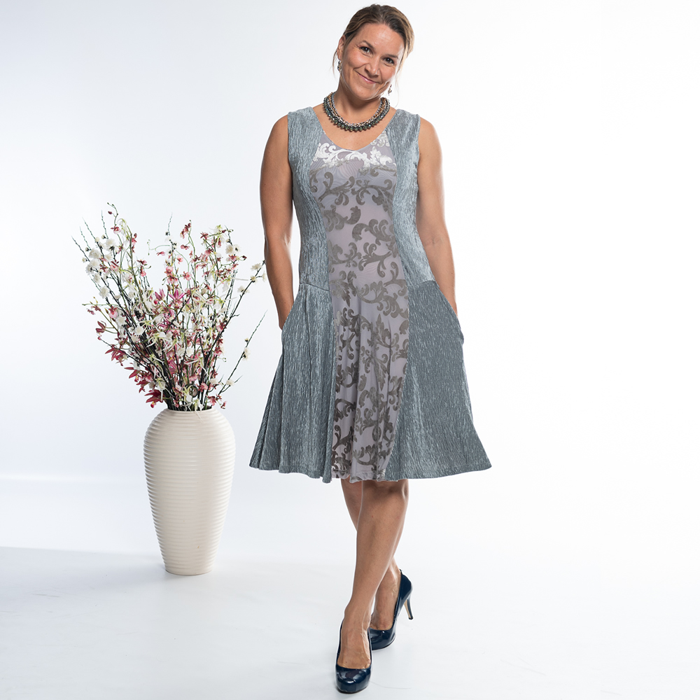 Plush velvet with silver woven strands give this elegant dress an extra touch. It falls nicely and flatters your lines.